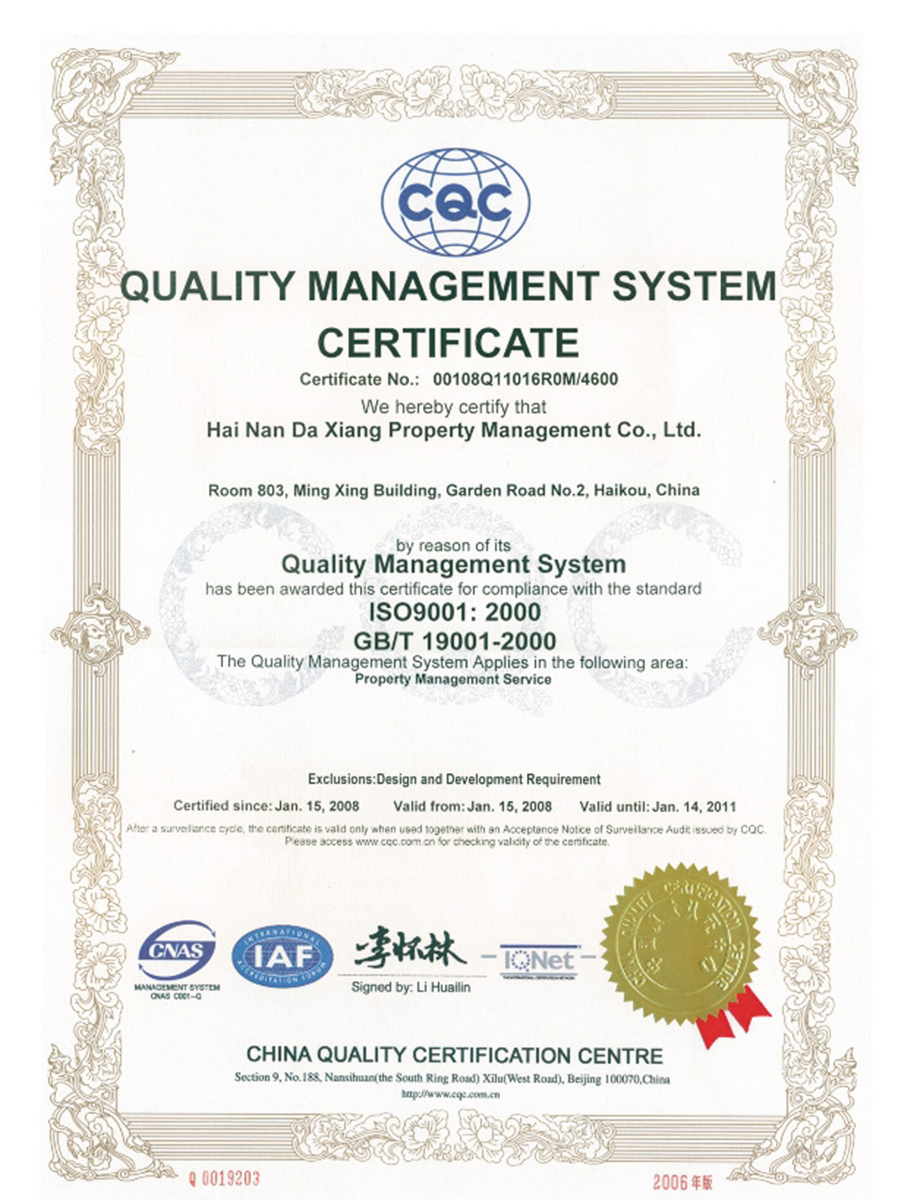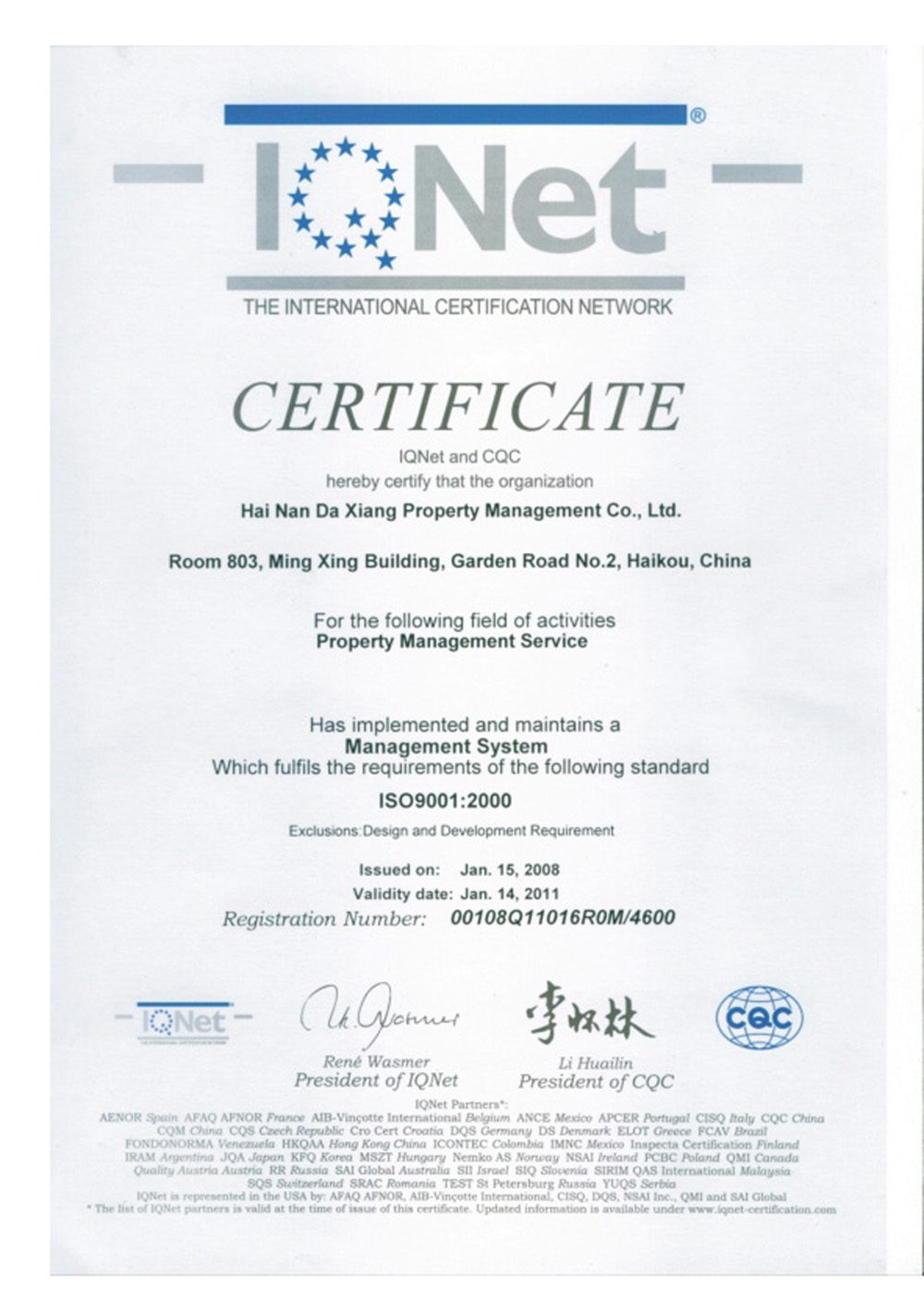 海南大祥物业服务有限公司成立于2000年,是一家享誉海南岛、致力于全国物业服务的物业管理企业。注册资本510万元。是国家物业管理一级资质企业、通过ISO9001国际质量认证的企业,是中国物业管理协会会员..[更多]